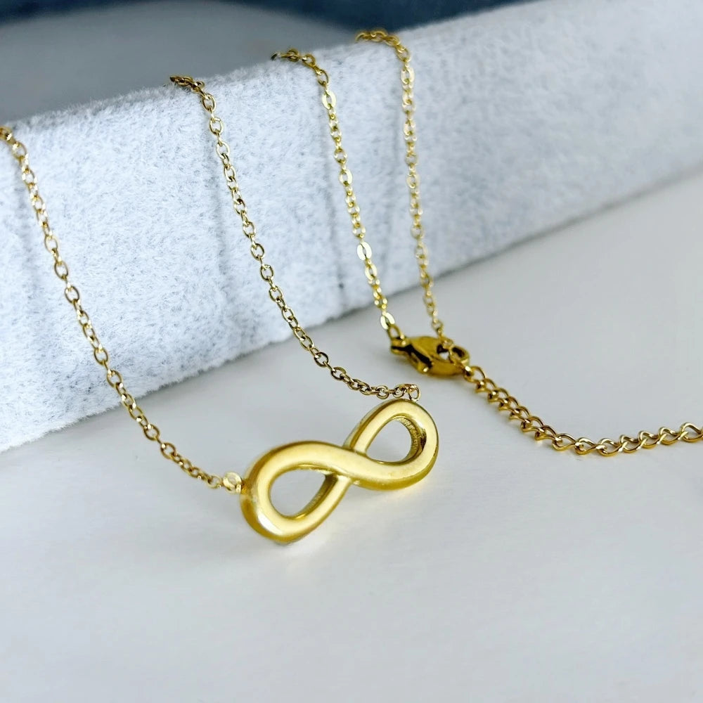 A sleek 18k gold-colored necklace featuring a stainless steel infinity pendant symbolizing love. This elegant choker adds a timeless and meaningful touch to any outfit, perfect for gifting or enhancing everyday style.